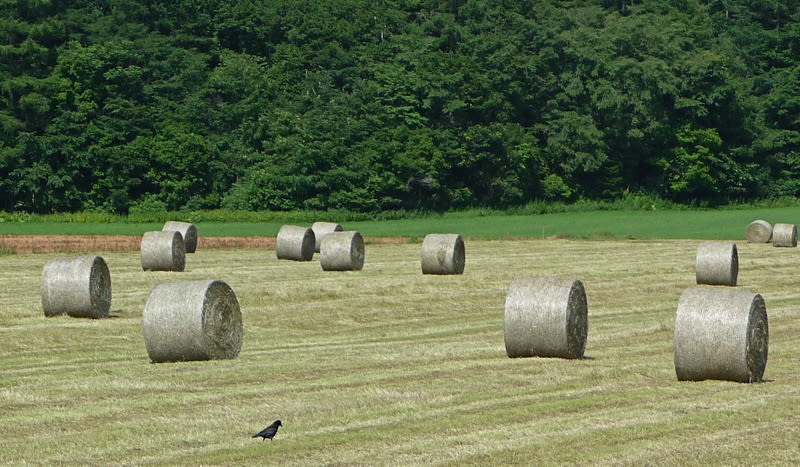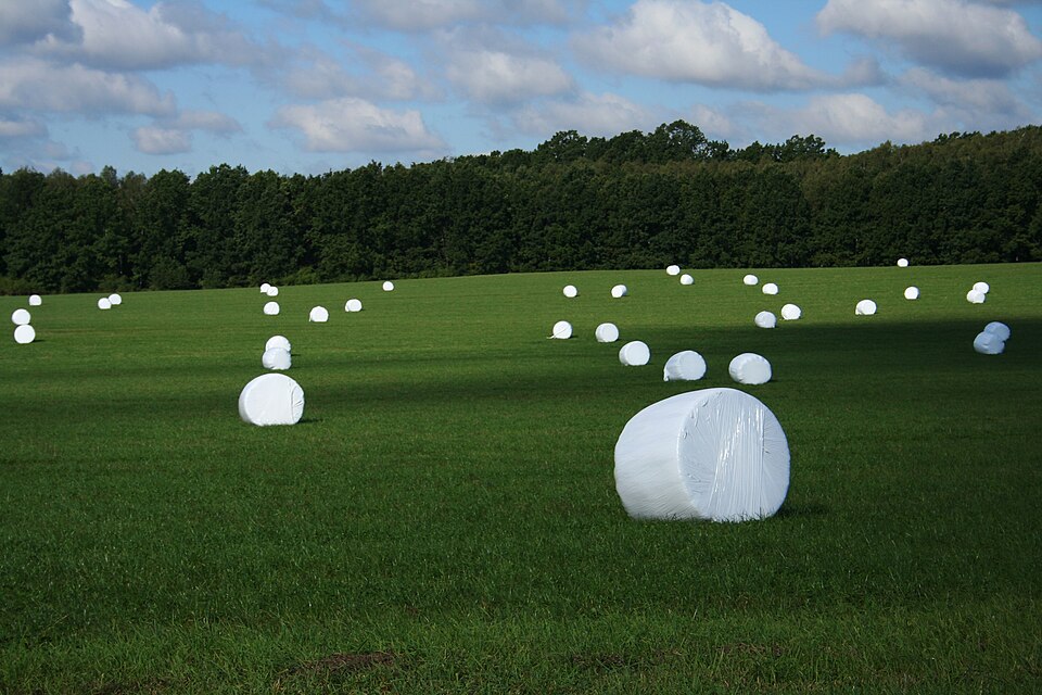 ロール状に梱包された牧草をラップでサイレージ化する技法です。一般的には採草地や農家の近辺に積み上げられますが、北海道など畜産が盛んな地域では採草地にポツポツと点在されている景観を見る事が出来ます。